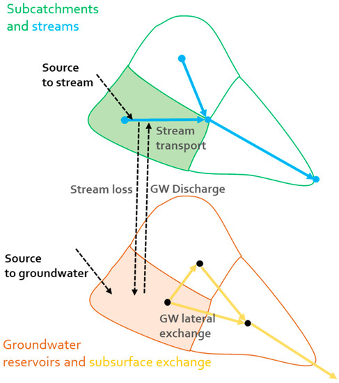 Explicit representation of groundwater in models of catchment-scale contaminant generation and transport is desirable to enable more accurate representation of transport pathways and processes, especially in catchments with a regional groundwater system and for contaminants such as nitrate that are transported through groundwater. In simple catchment models, a surface-water-centric approach is often taken, without explicit representation of the groundwater system. As an example, the catchment model SPARROW (Spatial Regional Regression on Watershed attributes) [1,2] divides a catchment into subcatchments and an associated stream network, and contaminant sources are transported into the streams and down the stream network without taking groundwater into account explicitly. However, often a large part of the rainfall/irrigation and associated catchment load moves via groundwater. There may be losses or transformations of contaminants in the groundwater, and water recharged in one location may not enter the surface water in the local stream, but in some distant stream. One of the motivations behind the work reported in this paper is to add a groundwater component to surface-oriented catchment models.