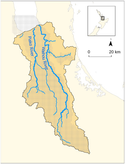The Hauraki case study addressed the catchment of the south end of the Haruaki Gulf in New Zealand (Figure 3) which is dominated by the catchment of the two main rivers, the Piako River and the Waihou River. The geology is predominantly ignimbrite [19], with well-drained soils in the upper catchment. Nitrogen loads entering the Gulf are of concern due to potential marine eutrophication [20], while concentrations in the streams are of concern due to excessive growth of macrophytes and epiphytic periphyton. The catchment has been studied as part of a research program on surface-groundwater model simplification and uncertainty [12]. The total catchment area is 3630 km2, which was broken into 7925 subcatchments and their associated stream segments.
