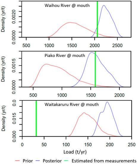 Example results comparing measured and predicted loads before and after parameter conditioning are shown for the downstream sites in Figure 5. Parameter conditioning generally shifts the distribution of predictions closer to the values estimated from measurements (‘measured’ values) and narrows the distribution of parameters. This reduction in bias is associated with selecting the best-performing set of parameters realisations. Despite the general improvement, there was some deterioration for some of the smaller catchments such as the Waitakaruru River catchment, because the parameters such as the global decay coefficients were dominated by sites with larger loads. While the model performance for small sites was sometimes poor, this does not have much influence on the overall result due to the choice of fit metric. Alternative fit metrics could have been used to place more emphasis on smaller sites (for example, by normalising the loads to measured loads in the fit metric). Other sites (not shown) had a negative bias, which was retained after parameter conditioning.