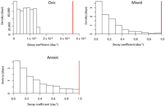 Distribution of groundwater decay coefficients for oxic, mixed and anoxic conditions. The posterior distribution is the histogram bars, while the prior value is the red line.