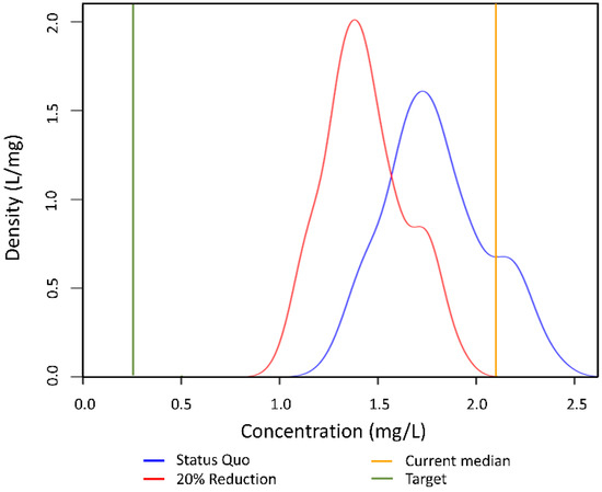 As an example, application of the approach, a load reduction scenario was run whereby all sources in the catchment were reduced by 20%. The resulting concentration is shown in Figure 7. The distribution of concentrations is biased low compared with the measured median, which is in part due to under-prediction of the load at that location. Additional errors may arise due to estimating the median concentration from the mean annual load. The load reduction leads to a 20% reduction in concentrations, due to the linear model formulation and the assumed uniform reduction of sources. Despite the reduction and uncertainty in predictions, the concentrations remain above the target level of 0.5 mg/L (an interim target, which is likely to be replaced). The bias in concentrations suggests that bias correction may be needed for comparing model predictions with absolute concentration targets.