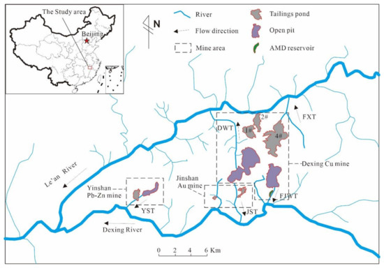 The Fuxi and Dawu are the tributaries of the Le’an River. The Le’an River flows through 2# tailing pond of Dexing copper mine, Fuxi tributary flows through 4# tailing pond, and Dawu tributary flows through the 1# tailing pond, open pit, mine dump, heap leaching field, and ore-dressing plants of Tongchang Cu deposit. The Fujiawu, Jinshan, and Yinshan are the tributaries of the Dexing River. The Fujiawu tributary flows through the open pit, AMD reservoir, and ore-dressing plants of Fujiawu Cu deposit, whereas the Jinshan tributary flows through the mining pit, tailing ponds, and ore-dressing plants of Jinshan Au mine. The Yinshan tributary flows through the mining pit, tailing ponds, mine dump, and ore-dressing plants of Yinshan Pb–Zn polymetallic mine.