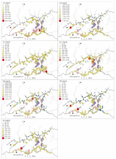 Figure 5 also shows that As, Pb, Zn, and Cd contents in the sediment samples had spatial similarities with those in the surface water. Interestingly, the sediment sample with the maximum Pb and Cd content was in the industrial park which exhibited the largest lead smelting enterprise in Jiangxi Province, which was consistent with the results of Teng et al. [26]. Copper, Cr, and Hg in the sediments exhibited unique spatial distribution patterns. The high concentrations of Cu appeared in the downstream of the Tongchang Cu deposit, which is the oldest deposit in the study area. The high concentration samples were downstream from the Au mine for Hg. Furthermore, spatial variations of the Cr concentrations were relatively low, and high concentrations were clustered primarily around Cu deposits. High HMs concentrations in surface water were primarily clustered at the tributaries closest to the mine areas, and the sediments were extended several kilometers downstream of the major rivers.