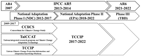 During various stages of adaptation strategy in Taiwan, the TCCIP project has always provided scientific insights by publishing dedicated scientific reports that consider the most recent IPCC reports while extracting the most recent literature and studies available in Taiwan. The first report, An Introduction to Climate Change in Taiwan: Scientific Report 2011, described climate change and its potential influence on existing hazards and emerging impacts, targeting academic researchers and adaptation policymakers. In addition, the SPM of reports was also translated as a potential reference for local policymakers. The “Climate Change in Taiwan 2017: Scientific Reports” was published by adopting methodologies published in the IPCC fifth assessment report and consisted of two reports: the Physical Scientific Basis and Impact and Adaptation. These reports have all become an integral part of Taiwan’s adaptation policy-making process, and both stages of the National Adaptation Plan [3,5] have included scientific evidence stated by the reports.