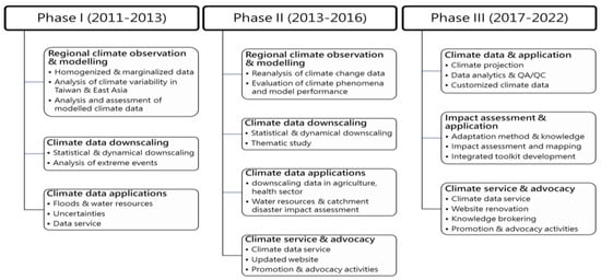 The first phase of the Taiwan Climate Change Projection and Information Platform Project (TCCIP) consisted of three teams who were responsible for three different core research topics: the analysis of regional observation and projections, the establishment of viable downscaling methodologies, and the application of climate data. The second phase (2013–2016) built upon the achievements of the previous phase, with improvements and updates carried out by four separate teams, each with specialized functions. To further enhance the quality of climate service, the TCCIP team digitized over 7.2 million historical climate data acquired from the Central Weather Bureau, which is affiliated with the Ministry of Transportation and Communications, Taiwan. In addition, tide stations for seal level observations were corrected into a unified dataset, while the grid dataset was updated for more accurate performance than the actual spatial distribution of observation data. These datasets received a total of 164 applications for various research purposes. The third phase (2017–2022) has emphasized the essence of a testbed platform, where new climate data is generated a more transparent and replicable way, while investigating practical approaches to close the gaps between research and practice, including plausible impact assessments, case studies, and tools. In addition, the TCCIP website has undergone its third renovation and now provides interactive information, adaptation knowledge, and climate projection data. A summary of the critical actions carried out during the different TCCIP project stages is outlined in Figure 5.