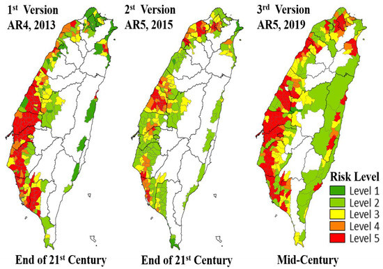The first version utilized 5 km hi-resolution data from the 1st TCCIP project phase, adopting the MRI GCM coupled with WRF to assess the occurrence of extreme precipitations above 350 mm and 600 mm per day, respectively, storm surges caused by typhoons, and the characteristics of droughts, and to establish indicators for different disasters. Vulnerability is estimated using environmental (inundation, drought characteristics, average tidal differences) and socio-economic (population density, human development index, productivity) indexes. The calculated risk is then mapped using GIS during three time periods, the historical baseline, the near future, and end of the 21st century, for four specific disasters, including flooding, storm surges, drought, and landslides. These maps attempt to assess disaster risks under future climate change scenarios instead of relying on historical observations, even though only one model was used for the analysis. The second version of the risk maps demonstrates flooding and landslide disaster risks under the influence of climate change. The risk maps were generated by adopting IPCC AR5 RCP scenario projections and updating other parameters such as elevation and subsidence observational data for vulnerability calculations. The segregation of calculated risk was analyzed using statistical Z-Score methods into five different levels. The evolution of the third version includes adopting statistical downscaling methodologies [71], multiple GCMs for climate projections, and updates on parameters such as the current and projected 2036 demographic data. In addition, the risk maps were demonstrated in spatial scales of national, county, township, and essential statistical areas. A comparison of the three versions of risk maps is shown in Figure 6.