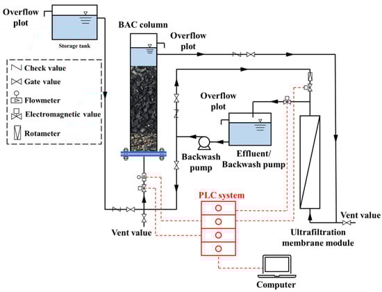 The experiment was performed in the pilot scale, which consisted of a BAC column and a gravity-driven UF system that was operated automatically by a programmable logic controller (PLC). A schematic diagram of the treatment process is shown in Figure 1. The BAC column with 200 mm in effective diameter and 3 m in total effective height, contained 1.6 m of granular activated carbon particles (1.7–4.0 mm, prepared from coconut shell), and 0.3 m of cobble supporting layer. Apart from that, the commercial hollow-fiber modules of the polyvinyl chloride (PVC) UF membrane were provided by Litree Purifying Technology Company (Suzhou, China), and they contained membrane fibers with an effective area of 10 m2 and a molecular weight cutoff of 100,000 Da. Furthermore, all pipes for water flow were made of PVC in the pilot-scale system.