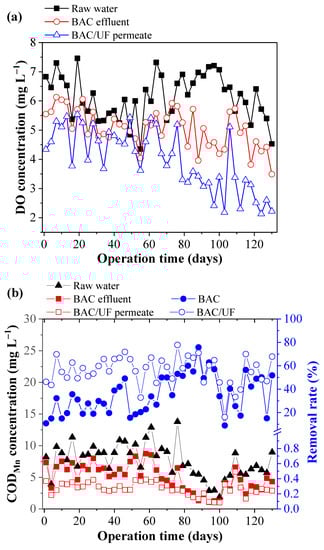 Characteristics of the raw water, the BAC column effluent, and the UF permeate were analyzed in this study. Prior to analysis, 0.45-µm cellulose acetate microfiltration membranes (Xingya Purification Material Co., Shanghai, China) were washed by nano-pure water (18 MΩ.cm) and then used to filter water samples. DO concentration and pH values were measured using a multiple handheld meter (Multi 3420, WTW, Munich, Germany). CODMn and UV254 were employed to evaluate removal performance. UV254, representing the unsaturated organic matter such as humic substances, was measured using a UV-visible spectrophotometer (UV-2450, SHIMDZU, Tokyo, Japan). Moreover, the concentrations of NH4+-N and nitrite nitrogen (NO2−-N) were determined using a spectrophotometer (722G, JK Co., Shanghai, China) with Nessler’s reagent and diazonium coupling reaction, respectively, whereas the total organic carbon (TOC) and dissolved organic carbon (DOC) concentrations were measured using an automatic total organic carbon analyzer (TOC-L, SHIMDZU, Tokyo, Japan). Before the TOC determination, the samples were mixed using a magnetic stirrer. Besides, the data were evaluated by conducting the IBM SPSS 26 one sample t-test and independent sample t-test.