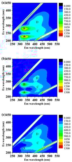 In order to confirm the removal mechanism of organic substances, the fluorescent substances were analyzed at the end of the operation. Four peaks are illustrated in Figure 3: Peak A (Ex/Em = 230.0/330.0 nm), Peak B (Ex/Em = 270.0/298.0 nm), Peak C (Ex/Em = 260.0/418.0 nm), and Peak D (Ex/Em= 320.0/410.0 nm) represented aromatic protein, soluble microbial production (similar to the protein), fulvic acid-like substances, and humic acid-like substances, respectively [29]. As seen from Figure 3, after the BAC treatment, the intensities of four peaks obviously decreased. This system showed a similar trend of fluorescent substance removal to previous studies where the synergistic behaviors of adsorption and microbial d degradation removed various pollutants in an effective way [30]. However, after treated by UF, the intensities of Peak C and Peak D were increased, which might be caused by the conversation from proteins to humic substances. The decomposition process of microorganisms including fungi on the surface of the UF membrane could contribute to such conversation [31]. Therefore, the above results proved the effective bio-degradation of organic matter in the BAC-UF system.