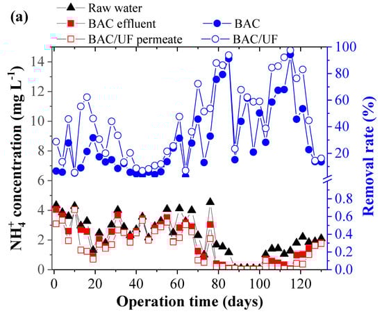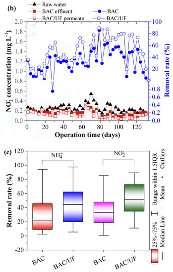 The removal performance of NH4+-N, NO2−-N, and NO3−-N by BAC-UF system: (a) NH4+-N, (b) NO2−-N, (c) comparison of BAC and BAC-UF for removals of NH4+-N and NO2−-N, (d) NO3−-N.