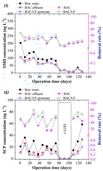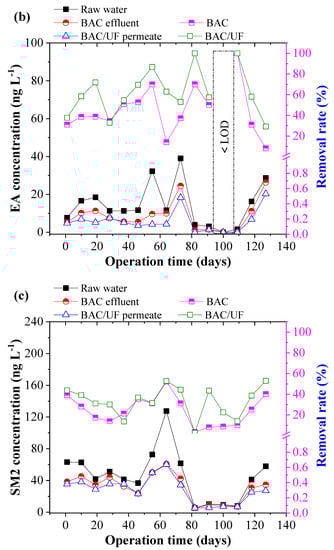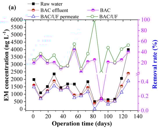 Figure 5 depicts the removal of ten typical PPCPs using the BAC-UF system. This work was carried out during the rainy season in South China, and the rainfall played an important role in influencing the PPCPs concentration due to the dilution effect. Thus, the PPCPs concentration in the raw water showed a decreasing trend from March to July. From Figure 5b,i, the concentrations of EA, SCP, and TMP were sometimes lower than the limitation of HPLC-MS/MS spectrometry due to the rainfall dilution. In most measurements, various PPCPs were detected by the HPLC-MS/MS instrument, especially the EM. Overall, the BAC-UF process showed high efficiency in the removal of PPCPs micropollutants and the average removal of total PPCPs reached 47.84%.