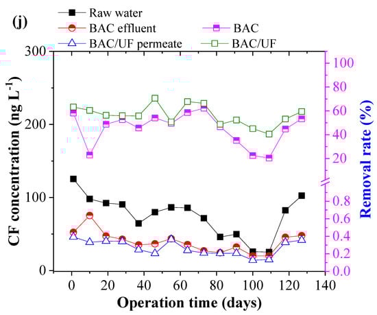 Removal performance of typical PPCPs by BAC-UF system: (a) EM, (b) EA, (c) SM2, (d) SMX, (e) SMP, (f) SMD, (g) SCP, (h) SDZ, (i) TMP, (j) CF.