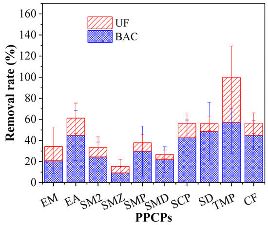 Specifically, the BAC effectively removed EM, EA, SM2, SMX, SMP, SMD, SCP, SDZ, TMP, and CF, reaching removal rates of 20.81%, 44.84%, 24.40%, 9.28%, 29.84%, 21.85%, 42.64%, 48.69%, 57.17%, and 45.02%, accordingly, whereas the gravity-driven UF improved the removal performance to 34.27%, 62.35%, 33.20%, 15.48%, 37.84%, 26.77%, 56.21%, 55.88%, 100.00%, and 56.42%, respectively. Therefore, the BAC-UF system showed significant removal rates for EA, SCP, SDZ, TMP, and CF, all of which are above 50%, while the system was characterized with a limited effect on the removal rate of SMX (15.48%). This removal difference may be related to the chemical structure, which favored adsorption and bioprocessing [32]. Besides, the SM2, SMP, and SMD might convert to the similar structure such as the SMX by the BAC system, causing the low removal rate [33].