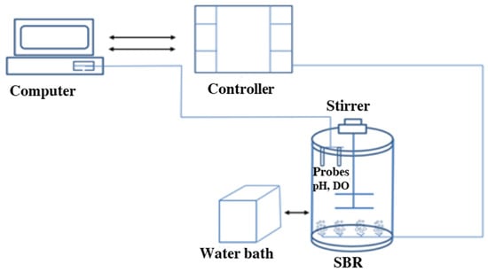 The experiment was conducted for 7 months (180 days) in a laboratory-scale SBR with a working volume of 10 L (Figure 1). The reactor was inoculated with biomass from a full-scale sidestream deammonification system in Plettenberg (Germany) and fed with a synthetic medium [31]. The system was maintained at a constant temperature set point of 30 ± 1 °C, the space between the inner-outer tube formed a water jacket. To adjust the temperature in the water jacket with an accuracy of (±0.1 °C), a water bath of Julabo F32 (Germany) was used. The air flow and circulating water conduits inside the reactor were made of stainless steel. Emptying the reactors took place through opening two manual ball valves of the diameter of 20 mm. Each reactor was provided with a stirrer RZR 2041 type (Heidolph, Germany) with a variable speed. The meters serviced probes for pH (Endress + Hauser EH CPS 471D-7211, Basel, Switzerland) and DO (Endress + Hauser COS22D-10P3/O, Basel, Switzerland). The pH was controlled in the range of 7.3–7.9 by adding 1.0 M NaOH. The reactor was operated in cyclic modes (24 h), including feeding (30 min, 4 L of the working volume), reaction (23 h), sedimentation (2 min) and decantation (28 min, 4 L of the working volume).