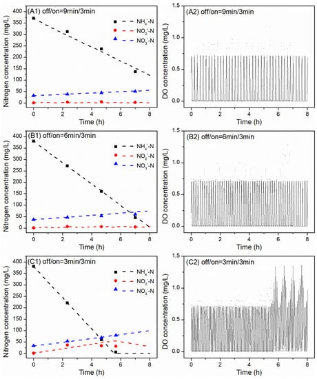 As shown in Figure 3C1, when the aeration mode fixed as off/on (3/3 min—scenario 7), the NH4-N concentration decreased from 381 to 5.9 mg N/L in 5.67 h, which made the AUR equal 18.1 mg N/g VSS/h. At the same time, the concentration of NO3-N increased from 33.6 to 79 mg N/L, which made the NPR = 2.1 mg N/g VSS/h. The NPR/AUR ratio reached the maximum value of 0.09 and the TN removal efficiency increased to 72%. In contrast, the NO2-N concentrations reached the maximum value of 37 after 2.33 h of the cycle.