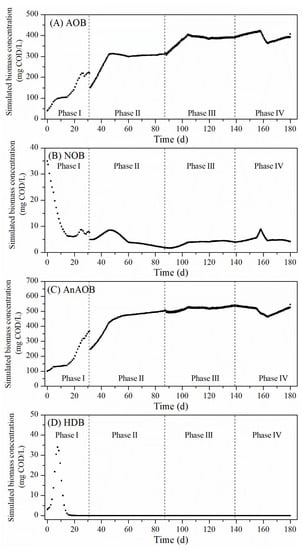 Predicted biomass concentrations in the SBR in the course of the long-term experiment: (A) AOB, (B) NOB, (C) AnAOB and (D) HDB.