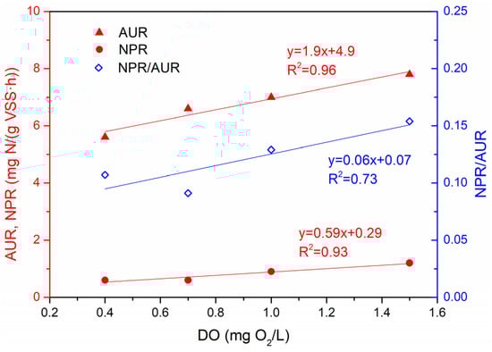 Effects of the DO concentrations under the intermittent aeration frequency off/on (12/4 min) on the AUR, NPR and NPR/AUR ratios in lab-scale SBR deammonification systems.