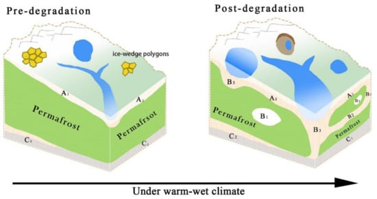 Permafrost degradation has greatly affected the permafrost–groundwater systems. For example, lowering the permafrost table would directly lower the SPW table. In the meantime, ground hydrothermal regimes have been modified, such as shortening the period of ground freezing and elongating that of ground thawing. These changes further impact cryo-hydrogeology and cryo-ecohydrology.