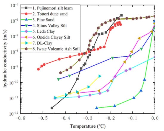 Changes in the hydraulic conductivity of saturated soils with soil temperatures and liquid water content of very warm permafrost soils. Notes: Curves 1, 2, and 8 are modified from [65,66]; Curves 3, 4, 5, and 6, from [63]; and Curve 7, from [64]. Soil unfrozen/liquid water contents are 25–53% (volumetric) for Curve 1, 3–13% (volumetric) for Curve 2, not specified for Curves 3 and 4, 3.64–36.37% (mass-based) for Curve 5, 6.52–23.4% for Curve 6 (mass-based), 4.98–11.90% (mass-based) for Curve 7, and 22–50% (volumetric) for Curve 8.