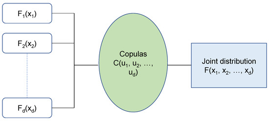 The copula function is seen as a cornerstone in the field of hydrological and meteorological risk analysis. Its uniqueness is stipulated in its ability to incorporate the joint probabilities of more than one dependent variable to anticipate the future risk of an event, as shown in Figure 2. It is applied in water resource engineering in analyzing flood frequency, precipitation, storm, and drought characteristics [29]. The joint probabilities of multiple attributes provide a wider span in analysis, thus improving the accuracy of the estimated risk [12].