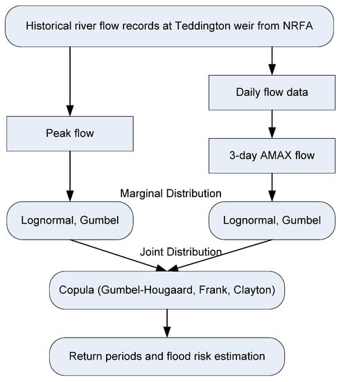 The flow chart of the proposed study is shown in Figure 3 below. The flood variables were obtained from historical records from the National River Flow Achieve (NRFA) website. The daily flow data and annual maximum (AMAX) flow data were obtained from the NRFA website. The daily flow data were then further computed to obtain the three-day AMAX flow. The flood pairs of peak flow and 3-day AMAX were then used for the analysis of the bivariate hydrologic risk at the Thames. Lognormal and Gumbel distributions were used to model the distribution of each flood variable by using the method of moment (MOM) and maximum likelihood estimation (MLE). The obtained distributions were tested for their statistical acceptance using the Kolmogorov–Smirnov (K–S) test, while the best distribution was tested using the root mean square error (RMSE) and the Akaike information criterion (AIC) methods. The marginal distribution that best fits the flood data was then used for multivariate risk analysis through copula methods. Three copula methods were used to model the dependence of flood variables: Gumbel–Hougaard, Cook–Johnson (Clayton), and Frank copulas. The best one from the three copula models was then used to calculate the primary, joint, and secondary return periods to characterize the bivariate flood risk.