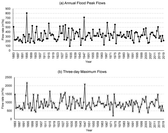 Streamflow hydrograph and flood characteristics of the River Thames: (a) the annual maximum flow rate; (b) the corresponding 3-day maximum flow rate.