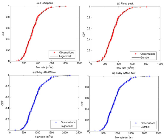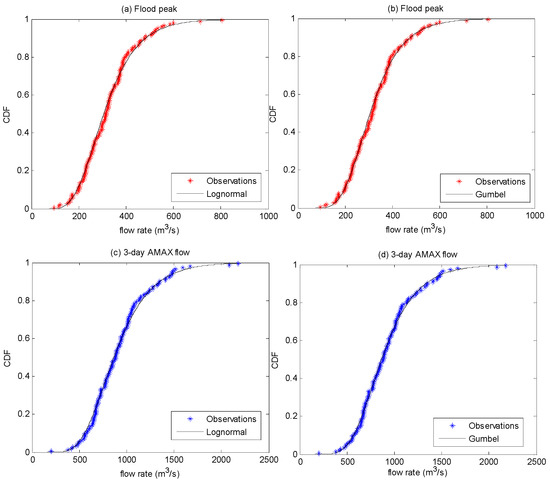 Comparison between empirical probabilities and theoretical probabilities with the parameters estimated by MLE: comparison between empirical probabilities (i.e., Observations) and expected probabilities obtained through (a) lognormal distribution for flood peak, (b) Gumbel distribution for flood peak, (c) lognormal distribution for the 3-day maximum flows, and (d) lognormal distribution for the 3-day maximum flows.