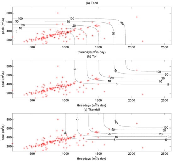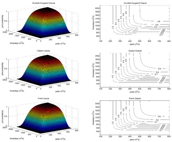 Three copulas from the Archimedean family, including Cook–Johnson (Clayton), Frank, and Gumbel–Hougaard, were applied to model the dependence among flood variables. The unknown parameters in the three copulas were estimated by the method-of-moments (MOM) estimator based on inversion of Kendall’s tau, as shown in Table 7.