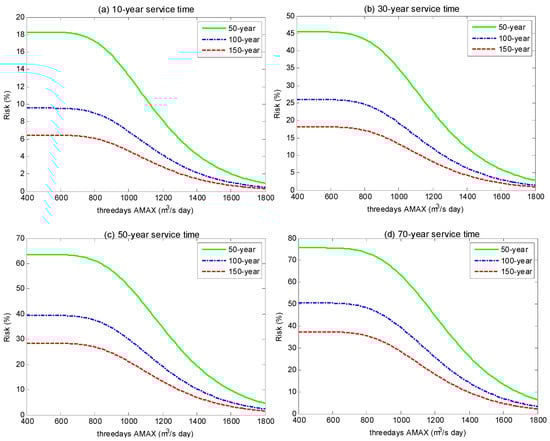 The implication for the bivariate risk of flooding peak flow and 3-day AMAX flow is to provide decision support for hydrologic facility design and the establishment of flooding diversion areas. The actual flooding control practices and the excess water of floods can be redirected temporarily to holding ponds or other bodies of water with a lower risk or impact to flooding. In flood diversion practice, the bivariate risk for flood peak and 3-day AMAX flow would be an important reference for the design of flooding diversion areas. For example, as shown in Figure 9 and Table 10, for the river levee with a designed flow of 626 m3/s and 10-year service period, the flooding risk value would be 18.3%, 18.3%, 18.3%, 18.1, 17.4, 15.8% with a 3-day AMAX being 400, 500, 600, 700, 800, and 900 m3/s, respectively. These risk values suggest that the flood diversion area should be designed based on a 3-day flow of 700 m3/s, such as the bivariate risk, which would not decrease significantly for the 3-day flow less than 700 m3/s.