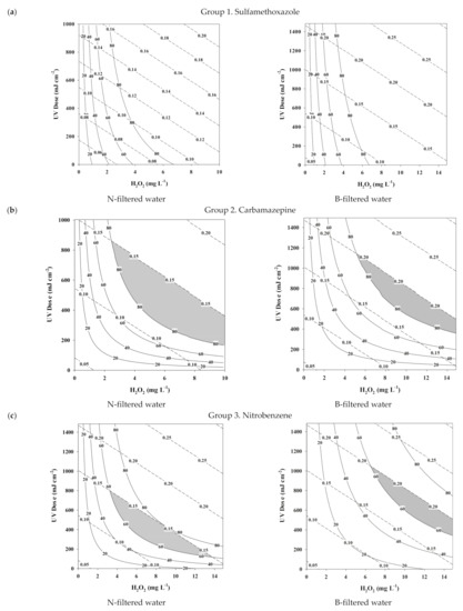 Contours of the EED value and removal efficiency at various UV doses and H2O2 concentrations: (a) group 1; sulfamethoxazole, (b) group 2; carbamazepine, (c) group 3; nitrobenzene.