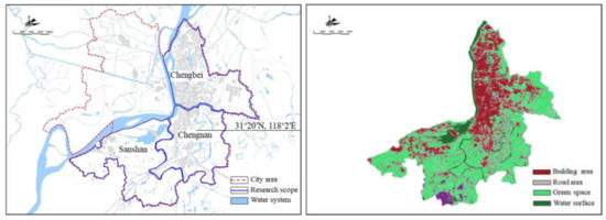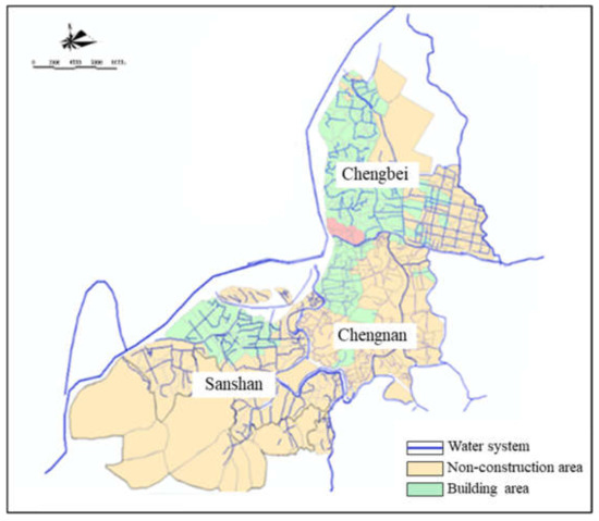 The aquatic environmental condition in Wuhu City has a significant effect on the lower reaches of the Yangtze River. This study scope was divided into three areas, namely, the Chengbei area, the Chengnan area, and the Sanshan area, and the study considered the drainage patterns and administrative divisions. Refer to Table 2 for the statistics of the study area, and Figure 1 for the general boundary divisions and land use in each area.