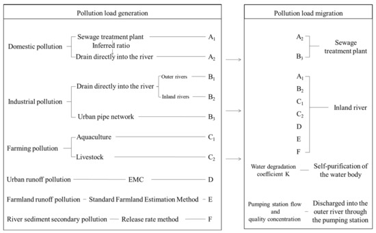 Using an investigation and analysis of the study area, the water pollution load generation and migration balance system was described. The pollution load primarily originated from six major sources, which included domestic pollution, industrial pollution, farming pollution, farmland runoff pollution, urban runoff pollution, and river sediment secondary pollution. In addition, the pollution load traveled through four migration routes: into the sewage plant, into the inland river, self-purification in the water body along the route, and then discharged into the outer river through a pumping station. The detailed relationship between the pollution load generation and migration is shown in Figure 3.