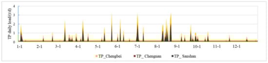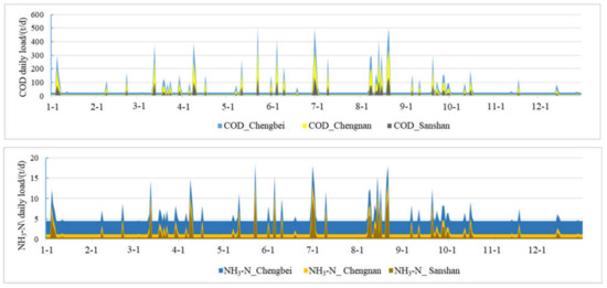 Domestic sewage, industrial wastewater, farming pollution, sewage treatment plant tail water, and river sediment pollution had no correlation with the runoff, considering the fact that the daily average pollution load was calculated directly. The farmland runoff pollution and urban surface runoff pollution were related to the rainfall runoff. Therefore, the daily average pollution load was distributed by considering the necessary factors, such as farmland retreat and rainfall. Using this method, the daily pollution loads into the rivers in the Chengbei, Chengnan, and Sanshan areas were estimated, and the results are shown in Figure 4. As shown in Figure 5 and Figure 6, the daily distribution of COD, NH3-N, and TP in the different areas revealed that the daily inflow of the different pollutants was consistent with time change and was similar to the rainfall distribution, which indicated that the loads of the three main pollutants were significantly affected by rainfall.