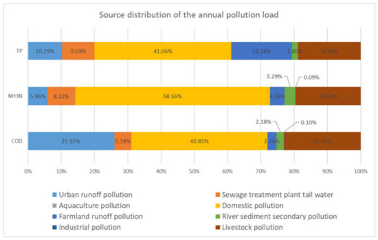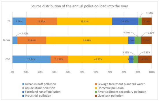 - According to the production and migration balance system, the proportion of various pollution loads entering the river was obtained with percentages greater 25%. The proportion of COD entering the river was 32.13%. The proportion of NH3-N entering the river was 25.68%. Finally, the proportion of TP entering the river was 30.28%.