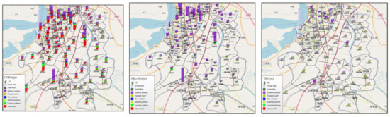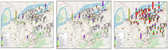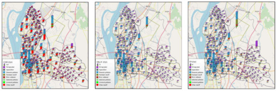 As shown in Figure 9, a comprehensive analysis of the pollution load distribution map shows that the distribution of the different pollutants was spatially consistent. Figure 10, Figure 11 and Figure 12 show that the spatial distribution of the same pollutant was significantly different and had a close correlation with the type of land. In general, the concentration in the construction areas was higher than that in other land-use types. In addition, the concentration of pollutants in the highly urbanized Chengbei area was higher than that in the Chengnan area and the Sanshan area, as shown in Figure 9. Additionally, the spatial distribution of the pollution load into the river revealed similar characteristics, but the spatial distribution of the same pollutants varied greatly. The pollution load into the river of the Chengbei area was meaningfully higher than that of the Chengnan area and the Sanshan area. The higher pollutant production and the pollution loads into the river of the Chengbei area might be caused by the higher domestic pollution production and discharge. The spatial distribution of the pollution load indicated that the highly urbanized Chengbei area should be an important target of pollution control for Wuhu City.
