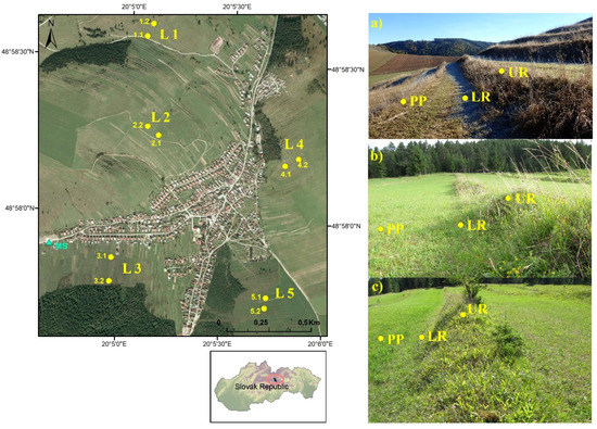 Localization of the study site of Liptovská Teplička village and typology of agrarian landforms (AL): (a) terrace (b) mound (c) mound-terrace; L1–L5—monitoring localities; MS—ground meteorological station.