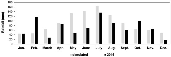 Thirty years of monthly simulated rainfall amounts vs. monthly rainfall rates recorded at the study site in 2016. Source: SHMI, 2021.