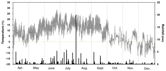 Precipitation and temperature records for the study area of Liptovská Teplička for the monitoring period April–December 2016.