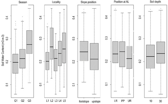 SWC variability related to season (Q—Q1: April–June, Q2: July–September, Q3: October–December), monitoring locality (L1–L5), position on slope (footslope and upslope), position at agrarian landform (UR—upper rim, LR—lower rim, and PP—productive plot), and soil depth (10 and 30 cm).