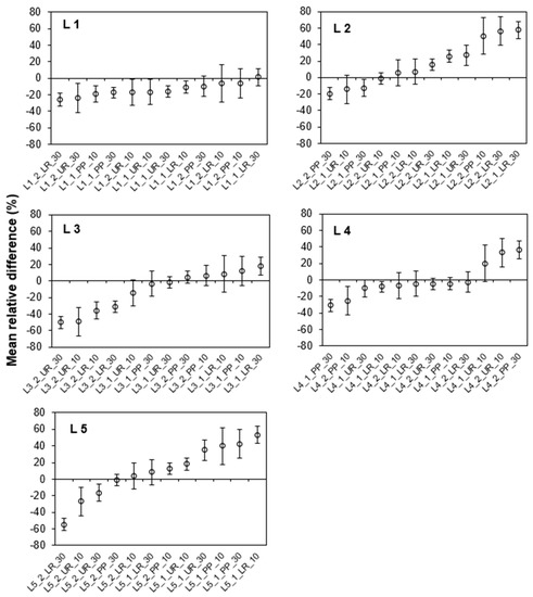 The SWC temporal stability was assessed using MRD values, where MRD values were ranked from lowest to highest for each monitoring locality (Figure 5), positions at AL (Figure 6a), position on slope (Figure 6b), and soil depth (Figure 6c). The MRD values show the relative wetness of given sampling locality according to the field average (Table 2). For example, sampling site L3_2_UR_30 exhibits approximately 50% (±7%) lower SWC capacity than the field average; thus, this sampling site could be considered relatively dry. In contrast, sampling site L2_2_PP_10 exhibits approx. 50% (±18%) higher MRD value, which makes it relatively wet in comparison with the field average. When comparing individual localities, it could be observed that locality L1 exhibits significantly lower MRD values than other localities (average MRD = −13.94%) with relatively small difference (27.33%) between minimum (−25.86%) and maximum (1.47%) value. In contrast, locality L2 exhibits the highest MRD with a range from −19.54% to 57.83%. With average MRD value equal to 16,51%, this locality could be considered as wettest among the all localities. Lower average MRD value (−11.40%), in the case of locality L3, indicates its lower SWC capacity. Locality L4 could be also considered moderately dry with an average MRD value equal to −0.73%. Locality L5 is characterized by the highest range (108,04%) between minimum (−54.76%) and maximum (53.28%) value. The highest negative MRD values were reached at sampling sites L5_2_LR_30 (−54.76%), L3_2_UR_30 (−50.11%), L3_2_UR_10 (−49.04%), L3_2_LR_10 (−35.78%), and L4_1_PP_30 (−30.95%), while the highest positive values were recached at sampling sites L2_1_LR_30 (57.82%), L2_2_LR_30 (56.39%), L5_1_LR_10 (53.28%), and L2_2_PP_10 (50.26%) (Figure 4). When comparing MRD values, depending on the position at AL, it could be observed that PP (3.01%) and LR (2.69%) positions exhibit higher values in comparison with UR positions (−5.71%) (Table 2). As indicated by higher SD and SDRD values, the LR positions are considered less stable in comparison with PP and UR. When comparing MRD values at footslope and upslope positions, it could be observed that footslope positions exhibit higher mean MRD (6.28%) in comparison with upslope positions (−6.28%) and, at the same time, footslope positions also exhibit lower SD and SDRD values. Concerning soil depth, the MRD at 10 cm reached higher mean values (13.25%) than in 30 cm (10.50%).