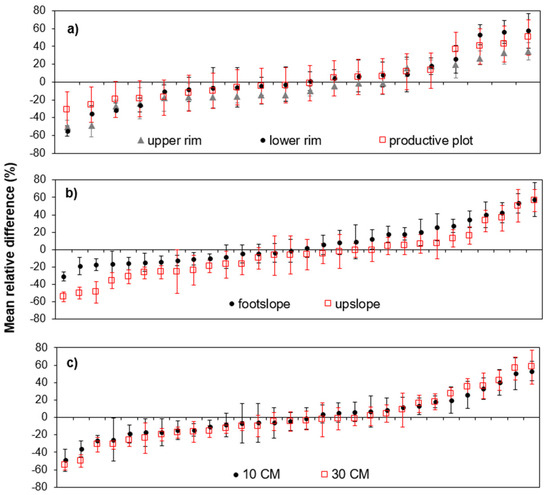 Mean relative difference (MRD) values ranked from lowest to highest according to (a) positions at AL (UR—upper rim, LR—lower rim, and PP—productive plot); (b) position on slope (footslope and upslope); (c) soil depth (10 and 30 cm). Vertical bars represent ± standard deviation values (SDRD).