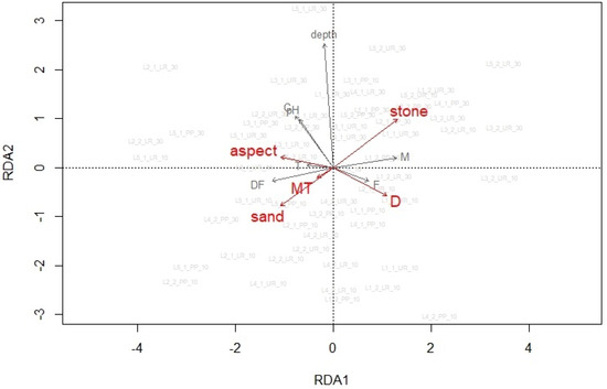 By constrained ordination, we obtained 10 RDA (constrained) and 49 PCA (unconstrained) axes, while the full model could be evaluated as statistically significant (F = 3.408; p-value = 0.001). The first two RDA axes explain 38% of total variation, while the first axis is statistically significant (F = 28,086; p-value = 0.004). Five factors were identified as highly correlated with average SWC values during the periods of rain. According to the ANOVA-like permutation test for RDA, slope orientation (F = 5.228; p-value = 0.010), content of sand fraction (F = 5.097; p-value = 0.014), stone content (F = 3.968; p-value = 0.034), AL type—mound-terrace (F = 7.164; p-value = 0.004), and diagonal AL course (F = 3.314; p-value = 0.042) could be considered the main factors regulating soil moisture variability, while soil depth also has a relatively strong impact (F = 3.019; p-value = 0.076) (Figure 7). Soil reaction and other types and courses of agrarian landforms have a smaller effect during the rain periods.