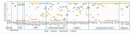 | Polybrominated biphenyl ethers (ng/L) | BDE 28 | BDE 28 | Σ6BDE 0.5 | 14 | 79% | 0.02 | 0.05 | 0.1 |