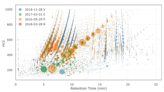 3.4. Non-Target Screening: Comparison of Site Signatures and New Compounds of Interest