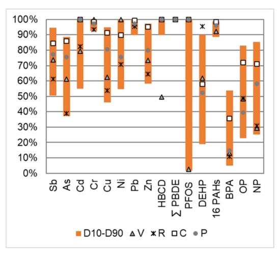| Organotins Chloroalkanes | Cd, Cr, Ni, Pb benzotriazole, Nap | As, Sb, Zn BPA, OP, NP, PBDE *, PFOS, HBCDD, A | Cu DEHP | BaP, Fluo |