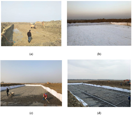 - Installation of geotextiles and filling of coarse sand: After geotextiles were laid on top of the gravel or PL, the cells were filled with a 100-mm-thick coarse sand layer (see Figure 6f).