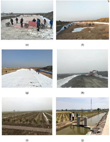 - Installation of geotextiles: Geotextiles were laid over the coarse sand layer to separate the planting soil and coarse sand layer (see Figure 6g).