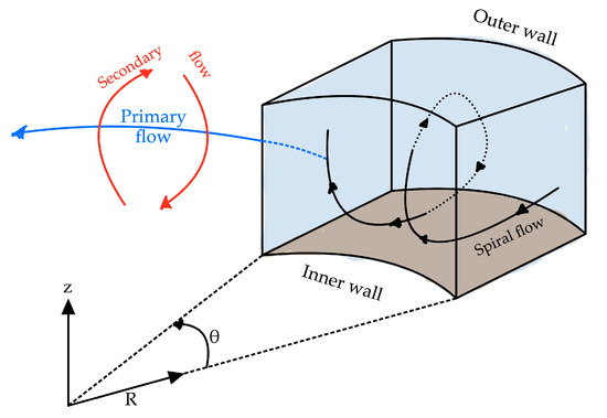 Schematic diagram of the spiral flow along curved channels as the combination of the primary and the secondary flow, which corresponds to tangential and radial flow in an annular flume.