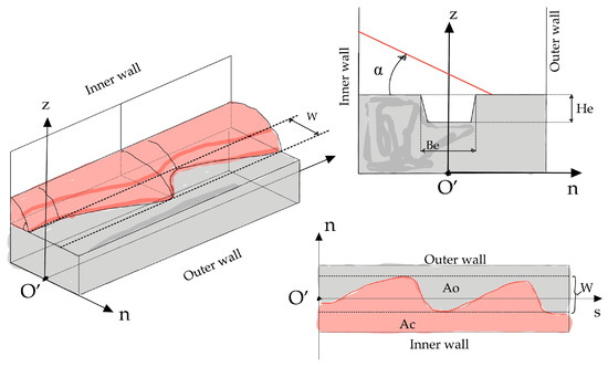 where Rc is the radius at the centerline of the flume, which is 450 mm, is the radius, and θ = tan−1(y/x). Hence, s = [0, 900] π mm; and n = [–50, 50] mm. The negative values of n indicate the half side near the inner wall of the annular flume. In contrast, the positive ones represent the half near the outer wall, and 0 is the flume centerline. Note that −50 is located on the inner wall side, and 50 is located on the outer wall.