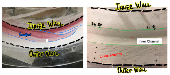 The sediment deposition patterns with the corresponding transverse slope profiles and the evolution of the bedrock incision were determined for Case 1 and Case 2. Figure 5 shows two photos of the resultant bed configurations for Case 1. The sediment bed coverage constituting the bedforms (red-colored) was deposited along the inner wall, and the exposed bed (white-colored) along the vicinity of the outer wall could be observed (Figure 5, left). The bed incision resulted in the formation of an inner channel along the centerline of the flume. Moreover, light and linear scours were also noticed on the exposed bedrock (Figure 5, right).
